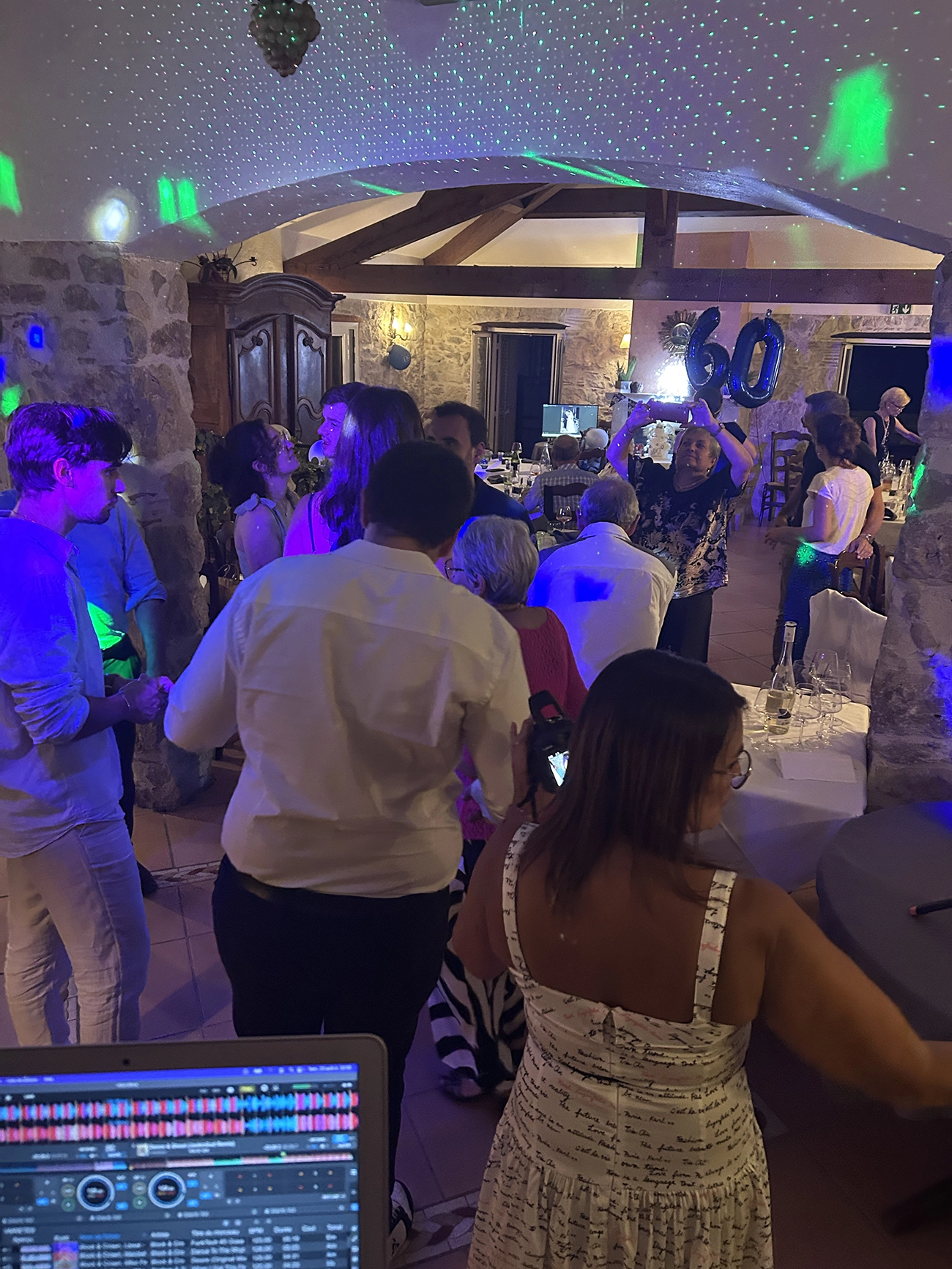 En début de soirée, je joue généralement des sons assez « lounges » avec un volume sonore modéré en début de soirée et pendant le repas. Progressivement je change mon style musical et j’augmente le volume afin de d’attirer vos invités sur la piste pour les faire danser sur des sons plus « dancefloor ».